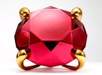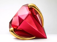 De diepe rode kleur en het spiegelende oppervlak stralen luxe en weelde uit, terwijl de opvallende gouden accenten een surrealistisch, speels karakter toevoegen.